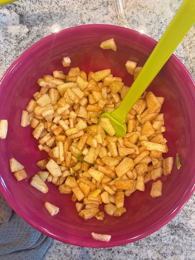 To begin, you’ll preheat your oven to 350º. I always forget this step and have learned that you don’t want to start baking something until the oven is at the correct temperature. So, preheat your oven! While your oven is preheating, you’ll want to peel, core, and chop your apples.